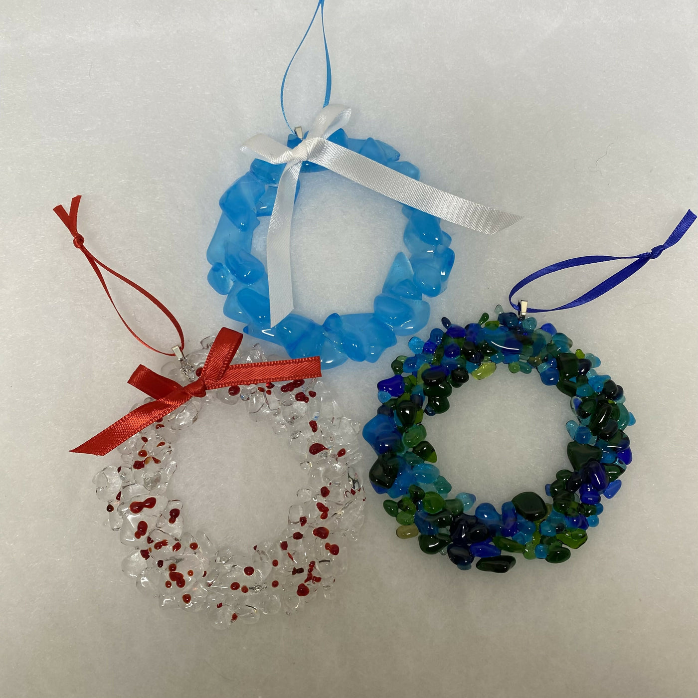 Fused glass Christmas wreaths and assorted ornaments.